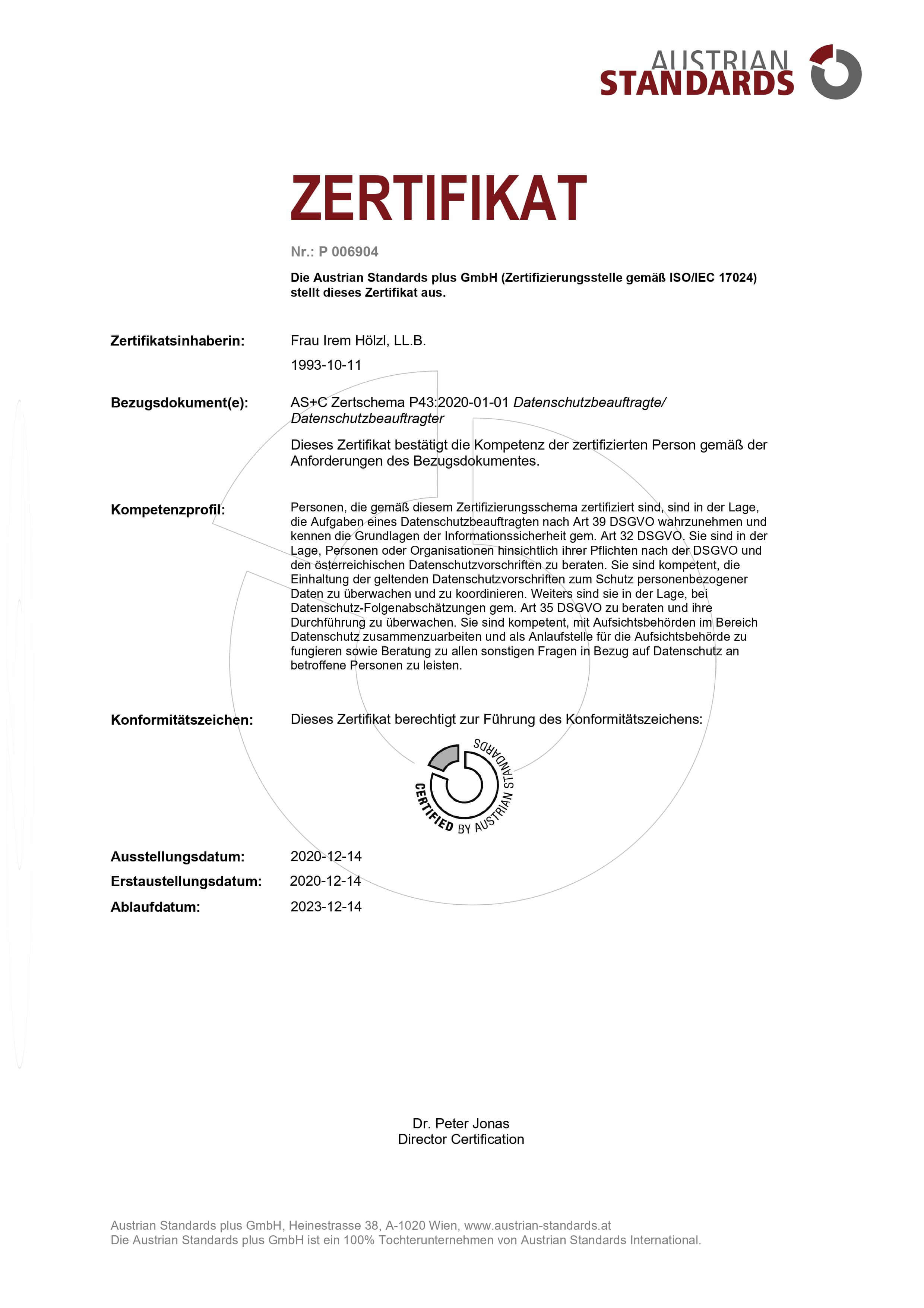 We work according to the highest data protection and security standards. To ensure that your company and your customers' data is protected in the best possible way, we have had our leading employees certified as data protection officers by Austrian Standards.